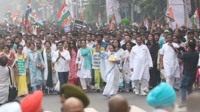এর আগে আজ ৪ নভেম্বর থেকে আনুষ্ঠানিক ভাবে রাজ্যে শুরু হয়ে গিয়েছে এসআইআর প্রক্রিয়া। মঙ্গলবার থেকে বাড়ি বাড়ি এনুমারেশন ফর্ম বিলির কাজ শুরু করেছেন বিএলও-রা। এরইমাঝে এদিন তিলোত্তমার বুকে প্রতিবাদ মিছিলের ডাক দিয়েছিল তৃণমূল কংগ্রেস। ধর্মতলায় আম্বেদকরের মূর্তির সামনে থেকে জোঁড়াসাকো পর্যন্ত এই মিছিলে পা মেলালেন খোদ তৃণমূল সুপ্রিমো মমতা বন্দ্যোপাধ্যায় ও তৃণমূলের সর্বভারতীয় সাধারণ সম্পাদক অভিষেক বন্দ্যোপাধ্যায়-সহ দলের প্রায় সবস্তরের নেতা-কর্মীরা। সঙ্গে ছিলেন কয়েক হাজার কর্মী, সমর্থক।