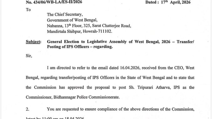 রাজ্যে প্রথম দফার বিধানসভা নির্বাচনের মাত্র ছয় দিন আগে বিধান নগরের পুলিশ কমিশনার মুরলি ধর-কে বদলির নির্দেশ দিল নির্বাচন কমিশন। তাঁর জায়গায় ত্রিপুরারি অথর্ব-কে বিধাননগরের নতুন কমিশনারের দায়িত্ব দেওয়া হয়েছে।