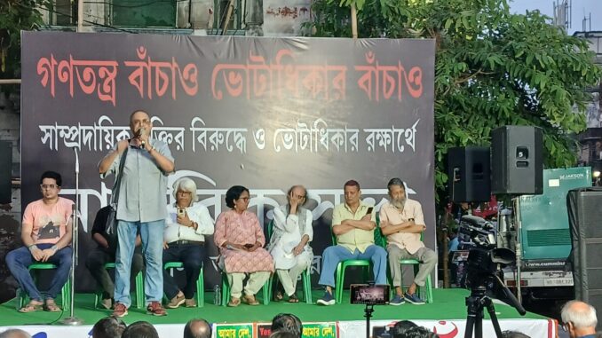 রোজদিন ডেস্ক : বাংলায় বহিরাগতদের ঢুকিয়ে ভোট করানোর চেষ্টা করছে বিজেপি। মুখ্যমন্ত্রী মমতা বন্দ্যোপাধ্যায়ের কেন্দ্রে ভবানীপুরে সেই একই খেলা খেলতে চাইছে তারা। এর প্রতিবাদে গর্জে উঠল দেশ বাঁচাও গণমঞ্চ। ‘গণতন্ত্র বাঁচাও, ভোটাধিকার বাঁচাও’ এই শ্লোগান তুলে আসরে নামলেন মঞ্চের প্রতিনিধিরা। সোমবার ভবানীপুর কেন্দ্রের হরিশ মুখার্জি রোডে এর প্রতিবাদে একটি নাগরিক সভা করে গণমঞ্চ। সভায় বক্তারা প্রত্যেকেই গণতন্ত্র বাঁঁচানোর পক্ষে সরব হন। ভবানীপুর পশ্চিমবঙ্গের একটি গুরুত্বপূর্ণ কেন্দ্র, যার একপাশে দেশবন্ধু চিত্তরঞ্জন দাসের বাড়ি এবং আর এক পাশে নেতাজি সুভাষচন্দ্র বসুর বাড়ি। সেই ভবানীপুর কেন্দ্রে সোমবার বিজেপি ও আরএসএসের কার্যকলাপের বিরুদ্ধে প্রতিবাদ জানিয়ে নাগরিক সভা করল দেশ বাঁচাও গণমঞ্চ। নাগরিক সংগঠন হিসেবে তারা প্রথম থেকেই বিজেপির বিভিন্ন অসাংবিধানিক, অনৈতিক কাজকর্মের বিরুদ্ধে সরব। সোমবার স্বয়ং মুখ্যমন্ত্রী মমতা বন্দ্যোপাধ্যায়ের বিধানসভা কেন্দ্রে বিজেপিকে একটিও ভোট না দেওয়ার দাবি জানাল গণমঞ্চ। এই দিন পথসভায় উপস্থিত ছিলেন চলচ্চিত্র পরিচালক হরনাথ চক্রবর্তী, কবি জয় গোস্বামী, কবি শ্রীজাত, চিকিৎসক শান্তিরঞ্জন দাসগুপ্ত, প্রাক্তন ফুটবলার সমরেশ চৌধুরী, অর্থনীতিবিদ অভিরূপ সরকার, মানবাধিকার কর্মী সুজাত ভদ্র, অনন্যা চক্রবর্তী, রন্তিদেব সেনগুপ্ত, অভিনেত্রী পিয়া সেনগুপ্ত, অধ্যাপিকা সৈয়দ তানভীর নাসরীন, চিকিৎসক অরিন্দম বিশ্বাস, অভিনেতা শ্যামল দত্ত, অভিনেত্রী সোমা চক্রবর্তী, অভিনেতা রাহুল চক্রবর্তী, অভিনেতা অর্ণব বন্দ্যোপাধ্যায়, চিকিৎসক সিদ্ধার্থ গুপ্ত, প্রিয়জিৎ মিত্র, শিল্পী পর্ণাভ বন্দ্যোপাধ্যায়, বাচিক শিল্পী সুতপা বন্দ্যোপাধ্যায়, বাচিক শিল্পী শোভন সুন্দর বসু, চিত্রা বসু, অভিনেত্রী এলফিনা মুখোপাধ্যায়, মারুফ হোসেন, শুদ্ধসত্ত্ব ঘোষ, অমিত কালী, প্রদীপ্ত গুহঠাকুরতা, সুমন ভট্টাচার্য প্রমুখ। সঞ্চালনায় ছিলেন সুশান রায়। সদস্যরা তাঁদের বক্তব্যে স্পষ্ট করে দেন, পশ্চিমবঙ্গের প্রায় ৯২ লক্ষ মানুষের নাম ভোটার তালিকা থেকে বাদ দিয়ে দেওয়া হয়েছে চক্রান্ত করে। বিভিন্ন ধরনের অসাংবিধানিক, অনৈতিক পন্থা অবলম্বন করে বাংলায় ঢুকতে চাইছে বিজেপি। যদি তারা ঢুকে যায়, তাহলে তারা শুধু মুসলিম বা দলিত নয়, সকলের গণতান্ত্রিক অধিকার হরণ করবে। সুতরাং বিজেপিকে একটা ভোটও দেওয়া যাবে না। নির্বাচনের আগে দেশ বাঁচাও গণমঞ্চের এই প্রতিবাদ সভা বিজেপিকে প্রতিহত করার শক্তি জোগাবে মানুষকে, এমনই মনে করছেন বিশিষ্টরা।