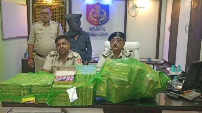 নিজস্ব প্রতিনিধি, নদীয়া : লক্ষ্মী পূজার রাতে বেআইনি শব্দবাজি বিক্রির অভিযোগে চাঞ্চল্য ছড়াল নবদ্বীপে। বুধবার গভীর রাতে নবদ্বীপ থানার পুলিশ অভিযান চালিয়ে গোসাই বাজার এলাকা থেকে বিপুল পরিমাণ নিষিদ্ধ শব্দবাজি উদ্ধার করে। ঘটনায় এক বাজি বিক্রেতাকে গ্রেফতার করা হয়েছে বলে পুলিশ সূত্রে জানা গিয়েছে।