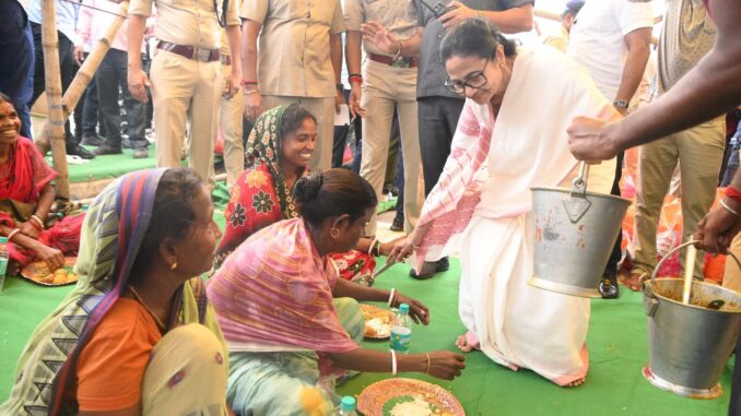 এদিন তিনি কলকাতা থেকে সড়কপথে রওনা দিয়ে আরামবাগ পৌঁছান। সেখানে গোঘাটের এক ত্রাণ শিবিরে নিজের হাতে দুর্গতদের খাবার পরিবেশন করলেন মুখ্যমন্ত্রী। ওই ত্রাণশিবির থেকে মমতা বন্দ্যোপাধ্যায় পৌঁছান কামারপুকুরে। তার পরে প্লাবন পরিস্থিতি পরিদর্শনে অন্য জায়গায় যাওয়ার কথাও রয়েছে তাঁর।