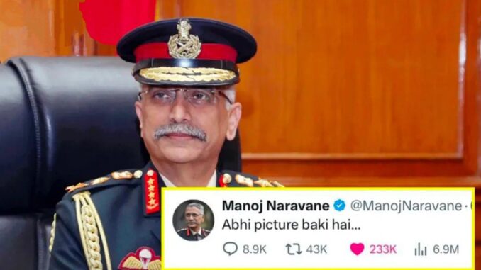 ২২ এপ্রিল পহেলগাঁওয়ে ধর্ম জিজ্ঞাসা করে পর্যটকদের উপর হামলা চালিয়েছিল সন্ত্রাসবাদীরা। সেই হামলার ঠিক ১৫ দিনের মাথায় পাকিস্তান ও পাক অধিকৃত কাশ্মীরের ৯ টি জঙ্গি ঘাঁটি গুড়িরে দেয় ভারতীয় সেনা। হামলার জেরে অন্তত ৯০০ জনের মৃত্যু হয়েছে বলে সূত্রের খবর। লস্কর ই তইবা, জইশ ই মহম্মদ-সহ একাধিক জঙ্গির আঁতুড় ঘর গুড়িয়ে দেয় সেনা জওয়ান। জানা যাচ্ছে, এই হামলায় লস্কর ই তইবা প্রধান হাফিজ সৈয়দের মৃত্যুও হতে পারে এবং জইশ প্রধান মাসুদ আজাহারের পরিবারের ১৪ জন সদস্যের মৃত্যু হয় বলে জানা যায়। বিরাট এই প্রত্যাঘাতের পর এক্স হ্যান্ডেলে একটি বার্তা দেন দেশের প্রাক্তন সেনাপ্রধান মনোজ নারাভানে। তিনি বলেন, ‘আভি পিকচার বাকি হ্যায়…’। তাঁর এই বার্তার পরই জল্পনা চরম শুরু হয়।