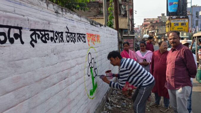 শহরের বিভিন্ন পাড়া ও গুরুত্বপূর্ণ রাস্তার ধারের দেওয়ালে দেখা যাচ্ছে হাতে আঁকা নানা স্লোগান ও দলীয় প্রতীক। কোথাও কবিতার ছন্দে রাজনৈতিক বার্তা, কোথাও আবার সরাসরি স্লোগানের মাধ্যমে ভোটের আহ্বান। পাশাপাশি রাজ্য সরকারের বিভিন্ন জনমুখী প্রকল্পের উল্লেখও উঠে আসছে এই দেওয়াল লিখনে। সব মিলিয়ে কৃষ্ণনগরের একাধিক এলাকা ধীরে ধীরে নির্বাচনী রঙে রঙিন হয়ে উঠছে।